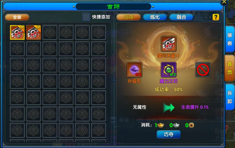 2、首饰巧夺只分成功和失败,消耗材料,失败不会掉级和破损装备;